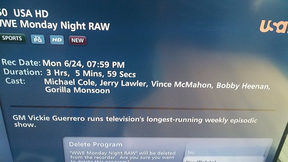 WNS fan Edd Hallowell sent this funny screenshot from his girlfriend's DVR which lists Bobby Heenan and Gorilla Monsoon as "cast" of WWE Monday Night Raw (opps).