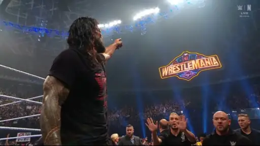 Punk attacked Reigns from behind, and chaos ensued. The three men brawled, with officials struggling to separate them. Punk and Rollins pointed to the WrestleMania sign, and Reigns followed suit, using steel steps to attack both men as the show ended.