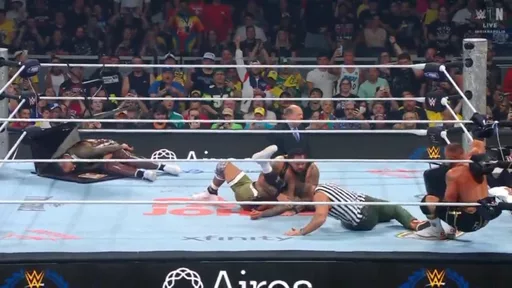Jimmy uses the chair to whack both members of the Vision but takes too long to follow up. Breakker hits a short, two-step Spear to drop Uso. Breakker's back is covered with Uso's blood; Uso's busted open on the forehead. Breakker spears Jey through the table still set up in the corner. Breakker drags Big Jim into the middle of the ring so Reed can hit a Tsunami! Reed covers and picks up the win at 8:09pm.